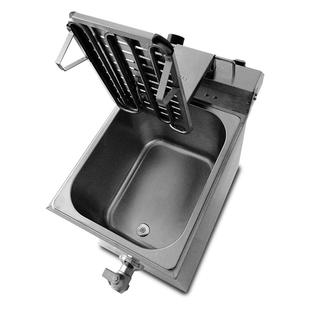 The heating element is removable with automatic deactivation and is equipped with an oil evacuation hole with filter placed on the bottom of the tank for simple and optimal cleaning