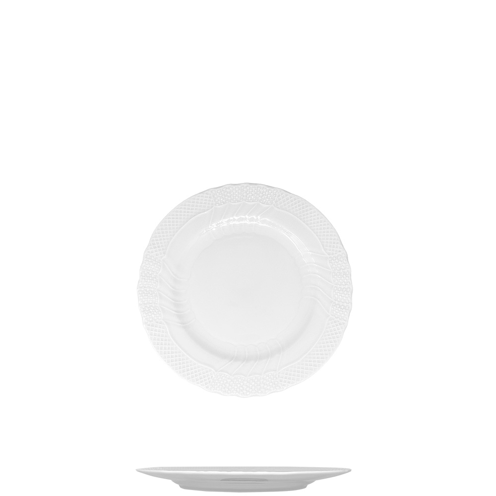 Crafted from refined white porcelain, these plates feature delicate embossed details along the rim, inspired by classic Florentine motifs.