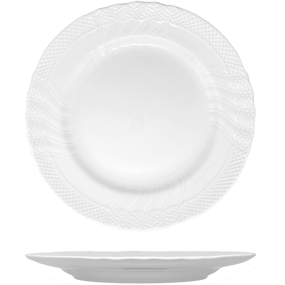 Crafted from refined white porcelain, these plates feature delicate embossed details along the rim, inspired by classic Florentine motifs.