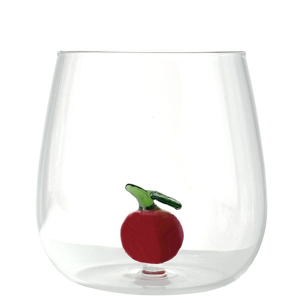 Each glass encloses a small blown-glass sculpture representing a fruit, carefully crafted with artisanal skill and exquisite detail.