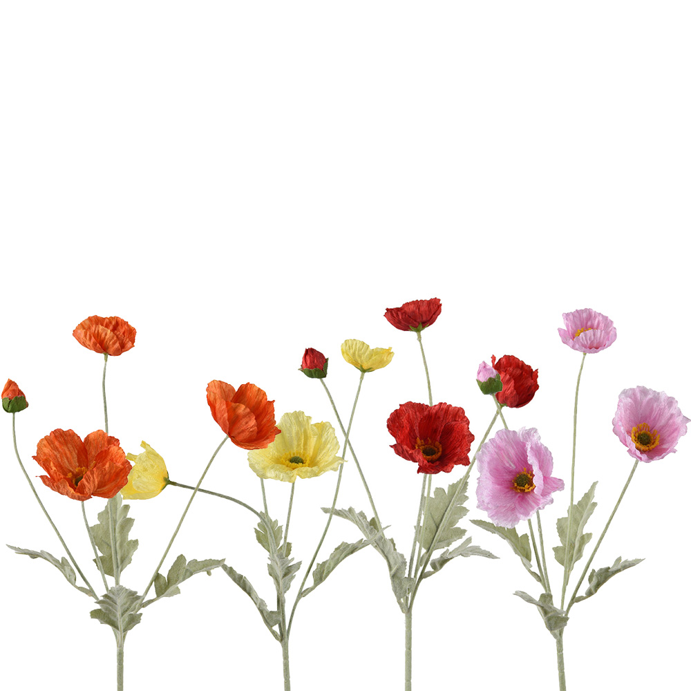 Branch with 3 poppies and a bud in flocked polyester with leaves
