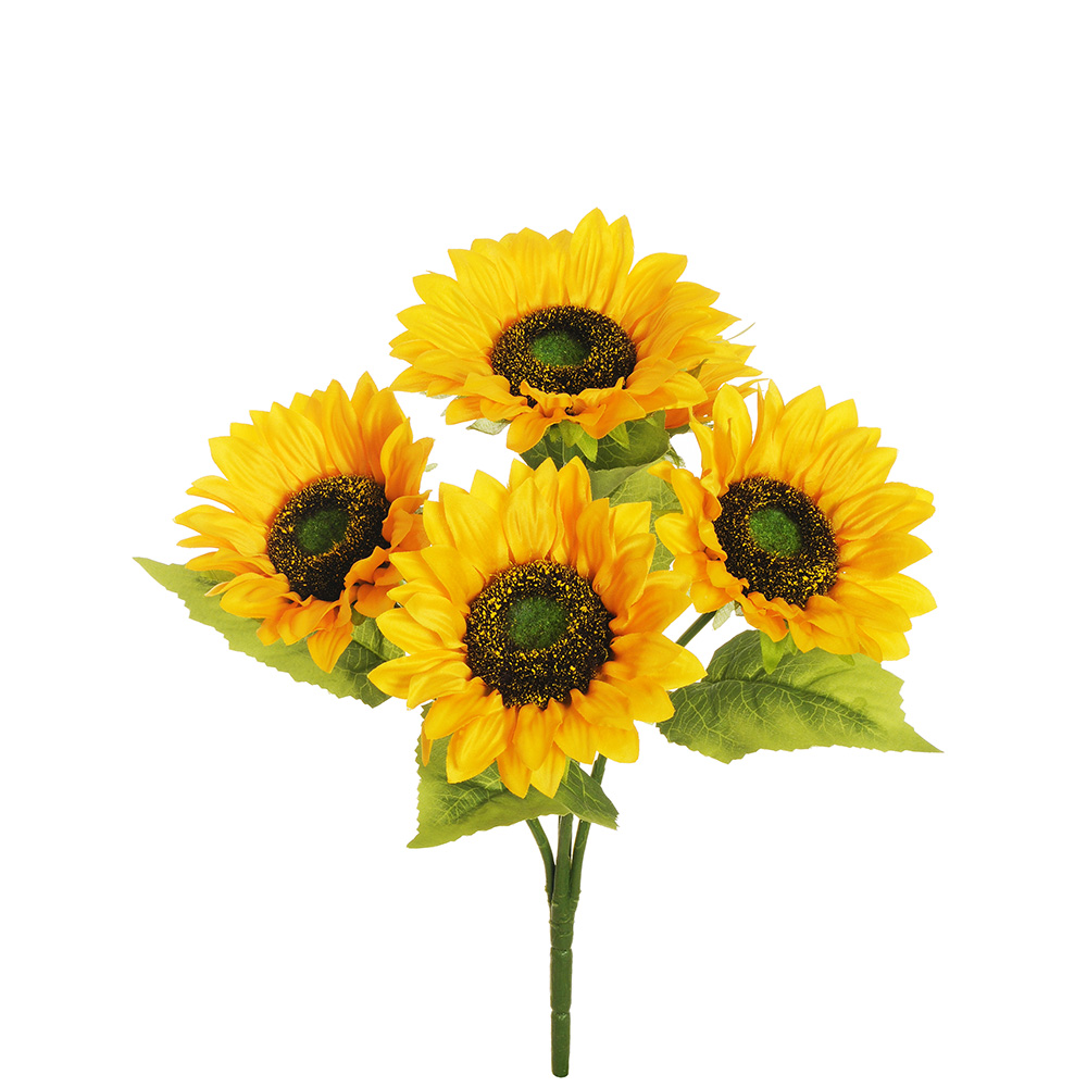 Bunch of 5 sunflowers in polyester with leaves Dimensions: 44 cm height