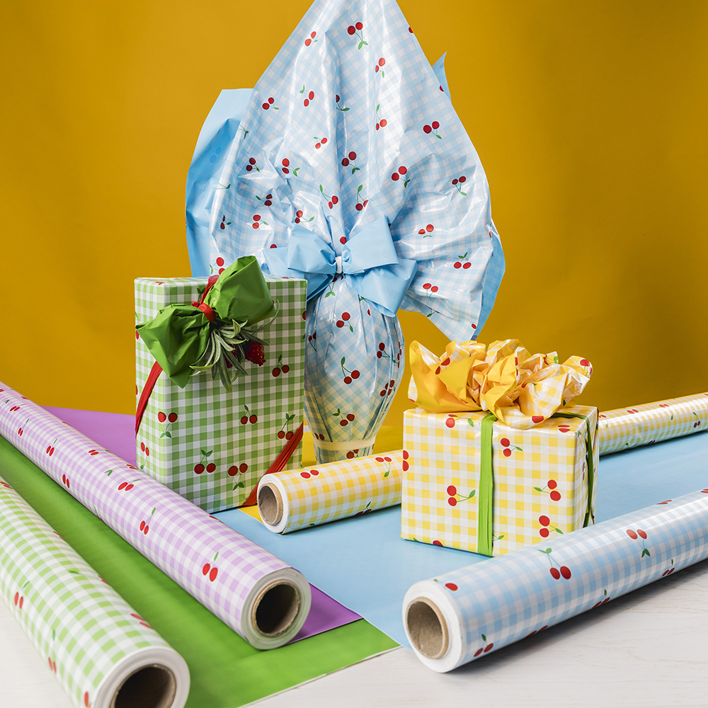 Cherry Roll, printed polypack on both sides Size: cm 100 × 25 m – thickness 40 my Available in yellow and green