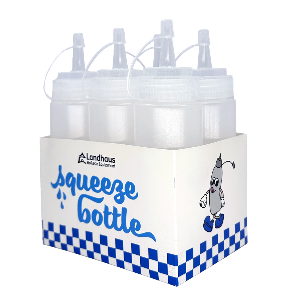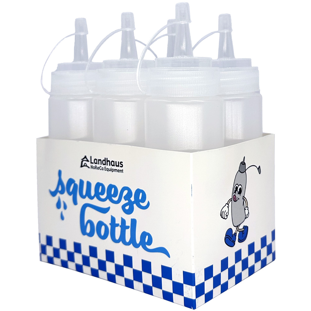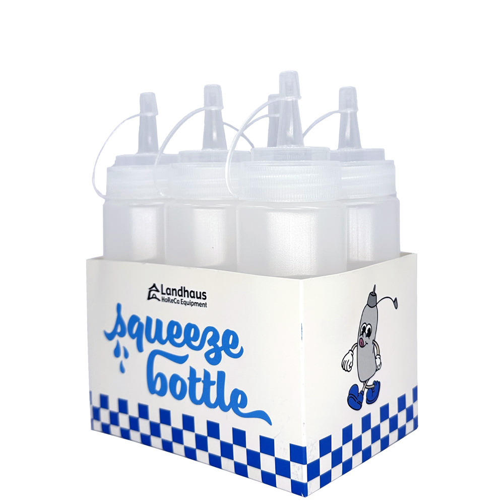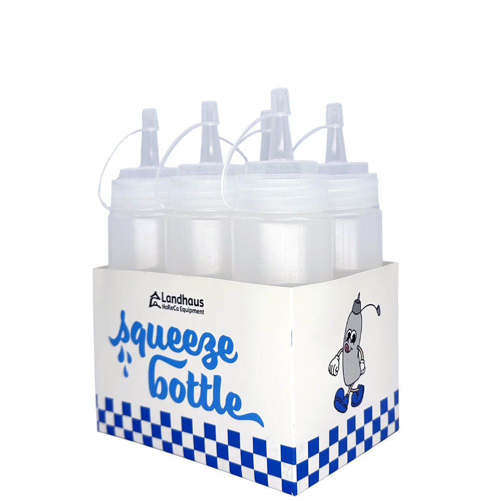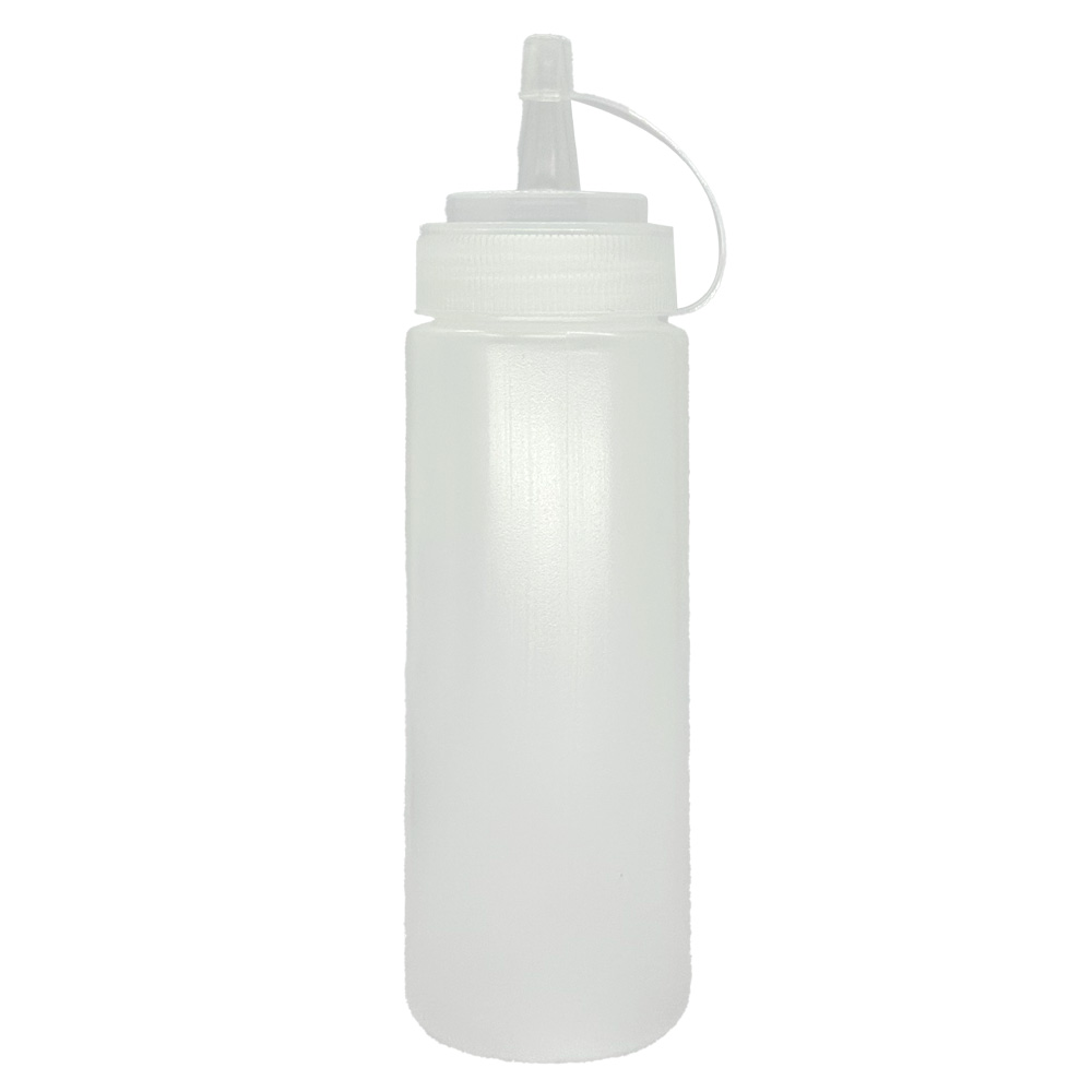 Clear Graduated Squeezer Bottle, made of polyethylene, suitable for contact with all food types and dishwasher safe.