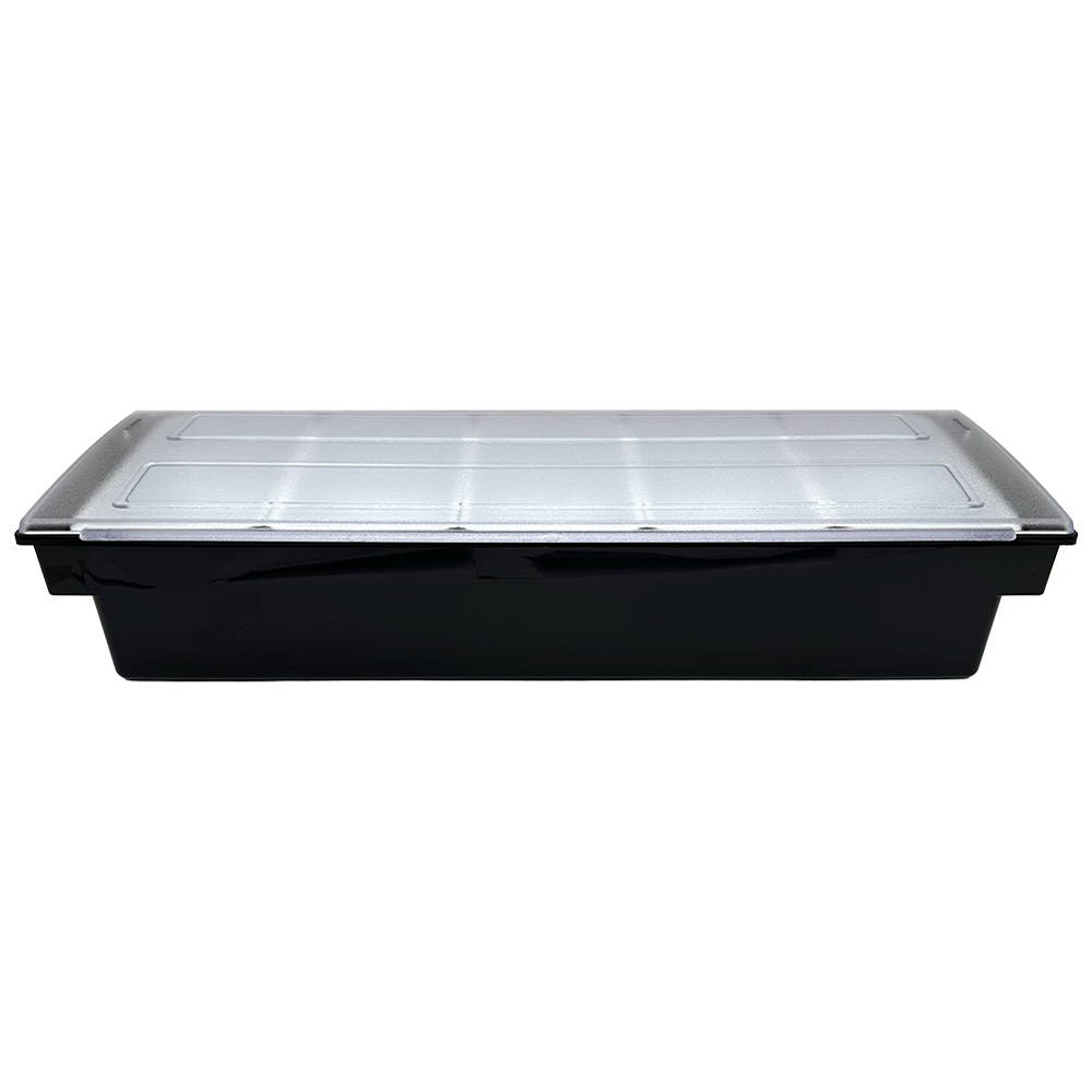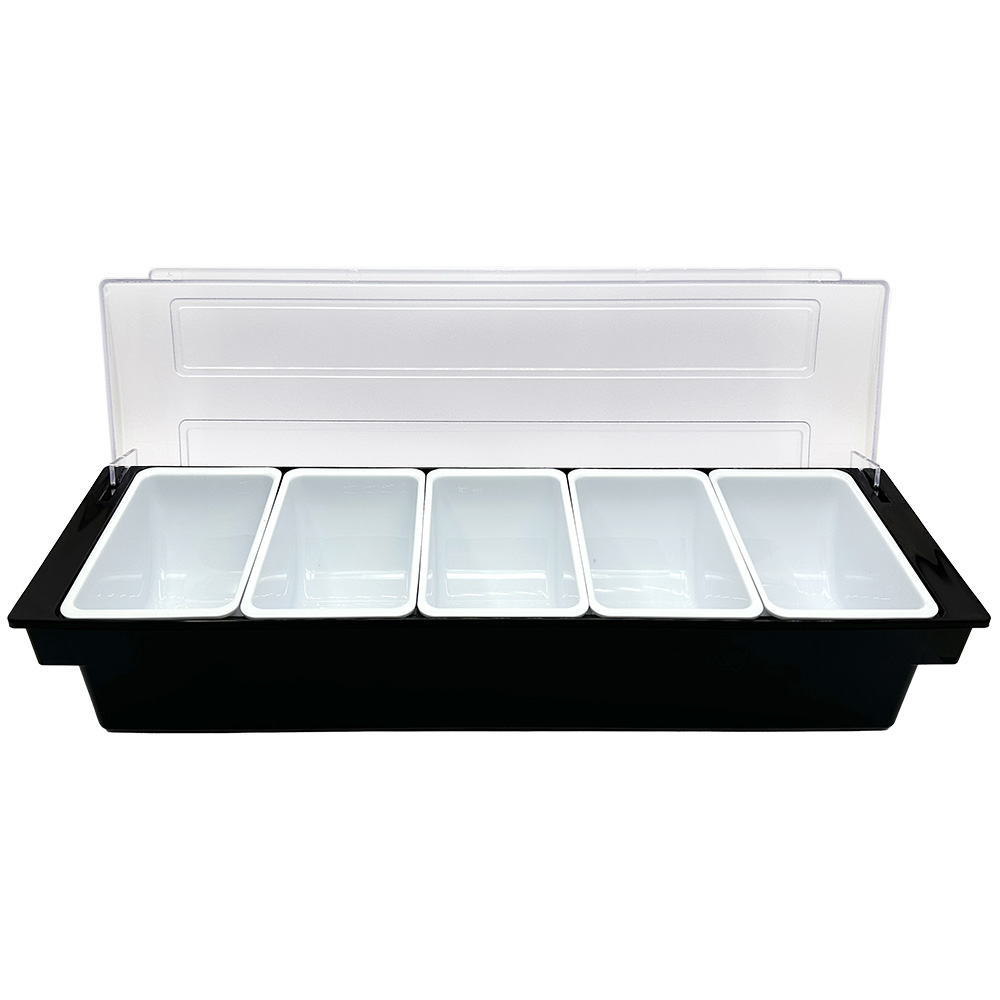 Black plastic condiment holder with 5 removable compartments. Dimensions: cm 49x16x10h