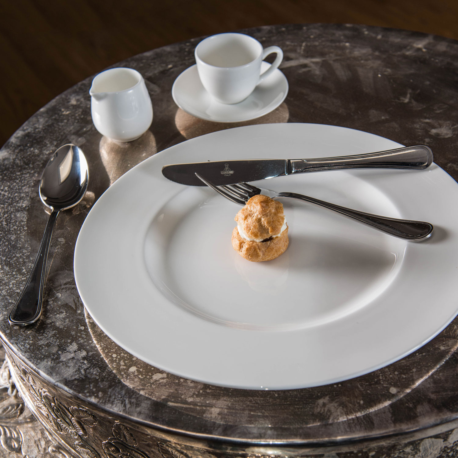 Flat plate cm.32 Lisa Marie, in Bone China, is characterized by a flat rim and a traditional shape.