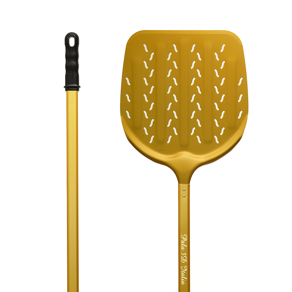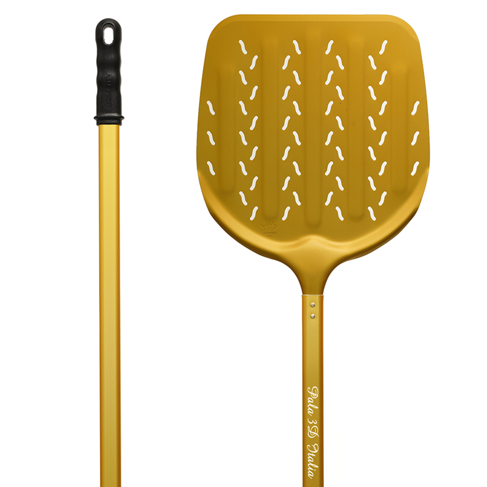 Professional perforated peel featuring an exclusive three-dimensional design, with raised areas on the blade surface that reduce friction and increase the smooth sliding of the pizza.