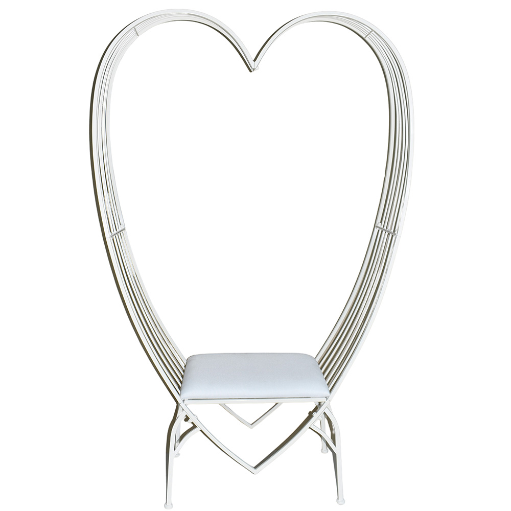 Decorative white metal bench with heart-shaped design and cushioned seat, perfect for romantic settings and event décor.