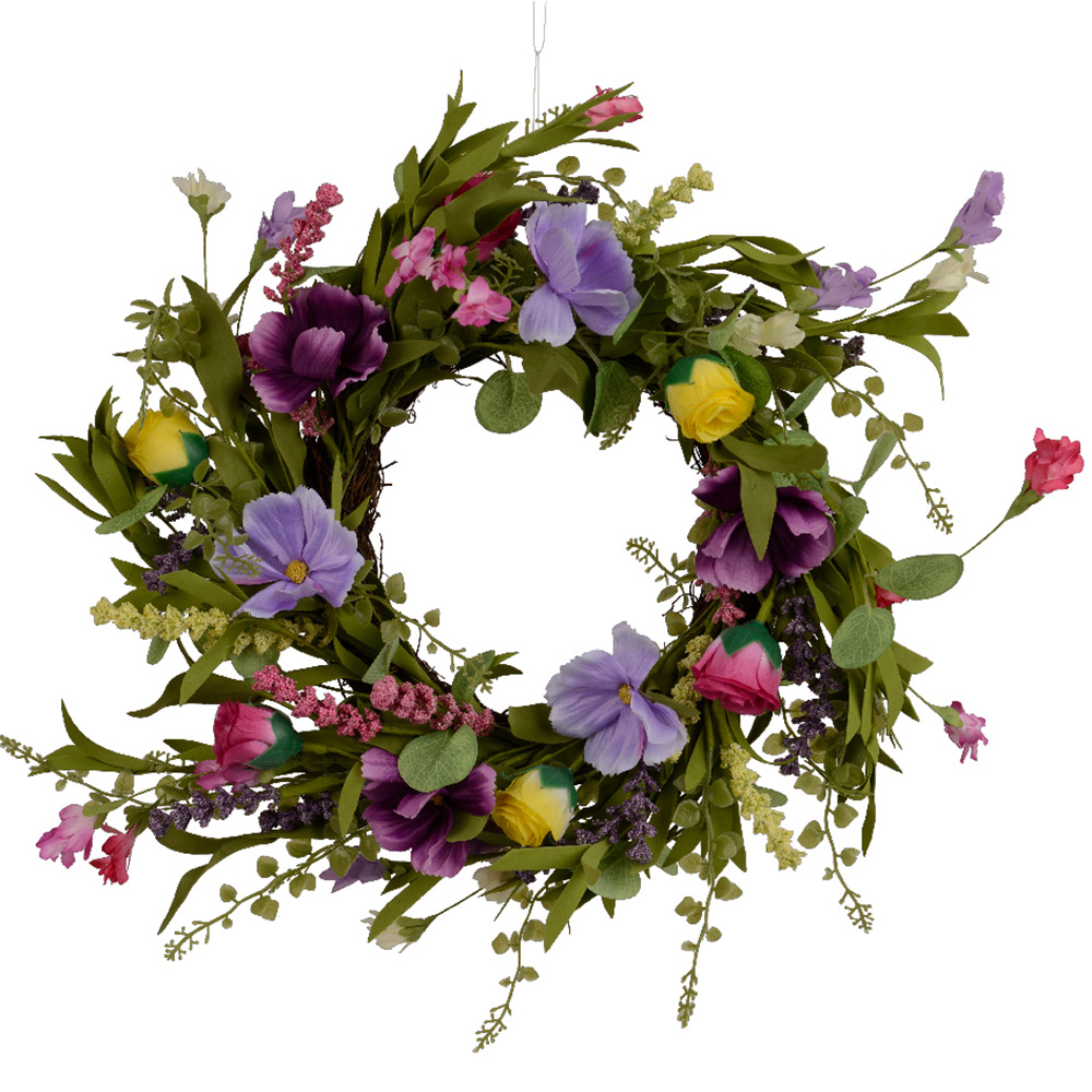 Pink-lilac floral wreath in polyester and PVC, with flowers, leaves, and decorative elements Dimensions: Ø 55 x 10 cm height