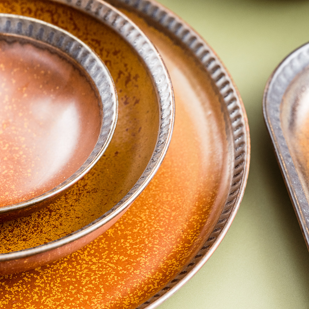 Flat plate, made of porcelain coloured with warm colours and different shades of brown, from the Pompei line by Landhaus. Dimensions: cm 28x3h