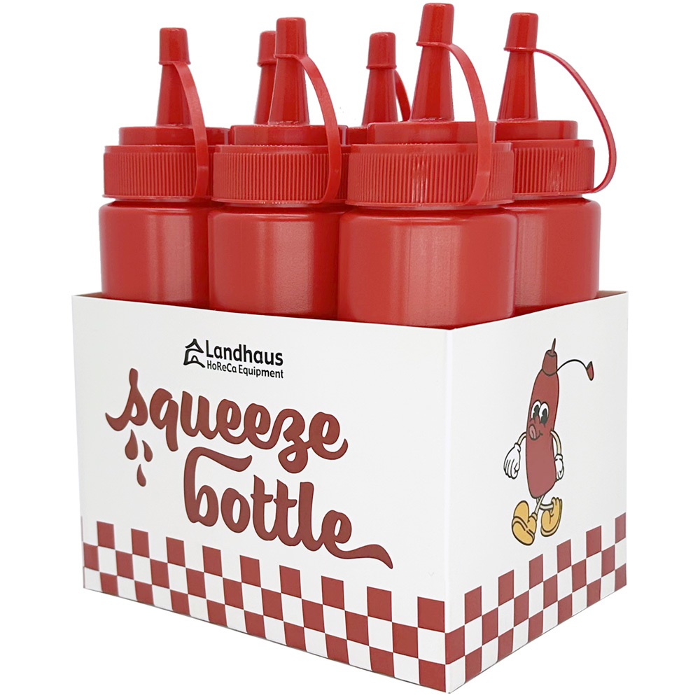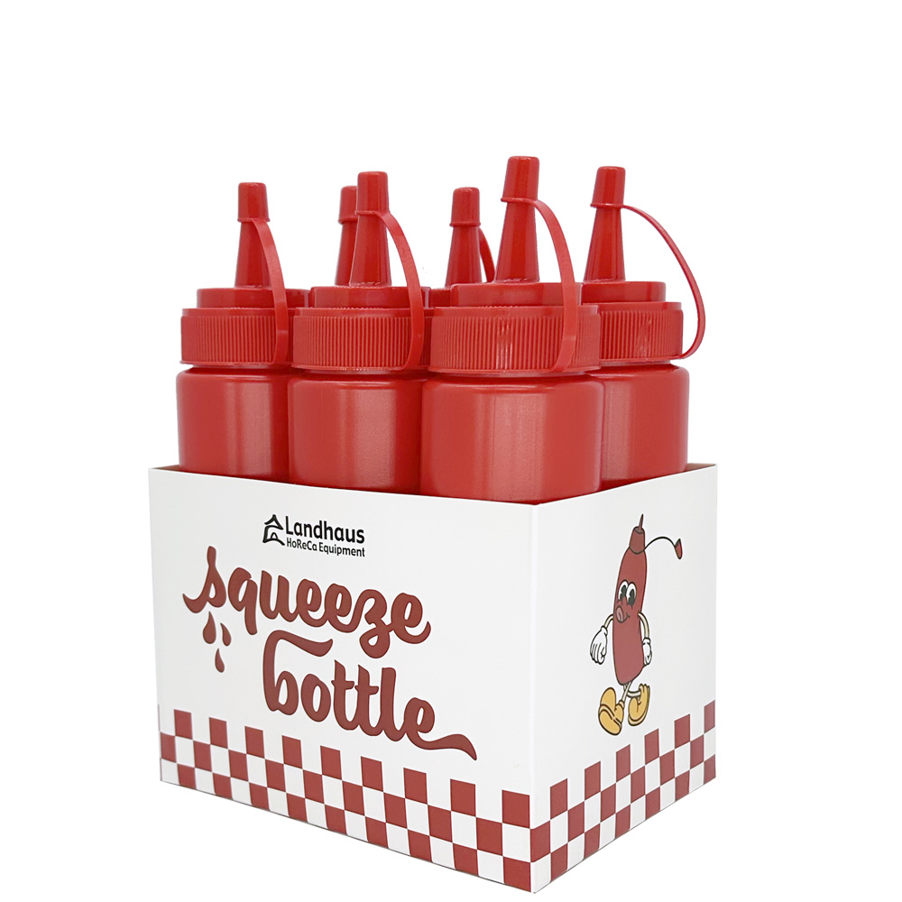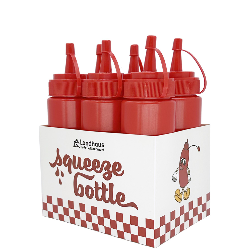 Red graduated Squeezer Bottle, made of polyethylene, suitable for contact with all food types and dishwasher safe.