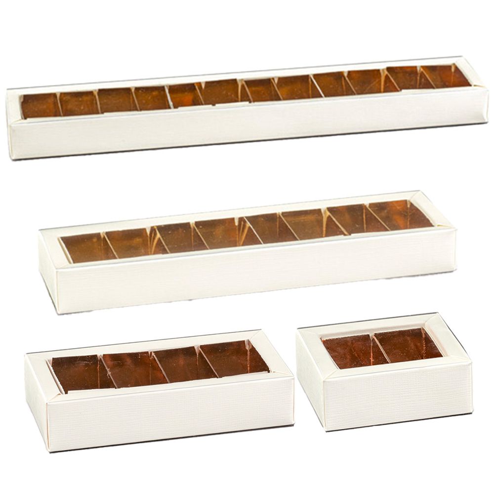 White box with dividers, made of red linen-effect cardboard, with gold interior and acetate closing band