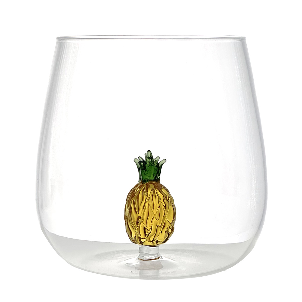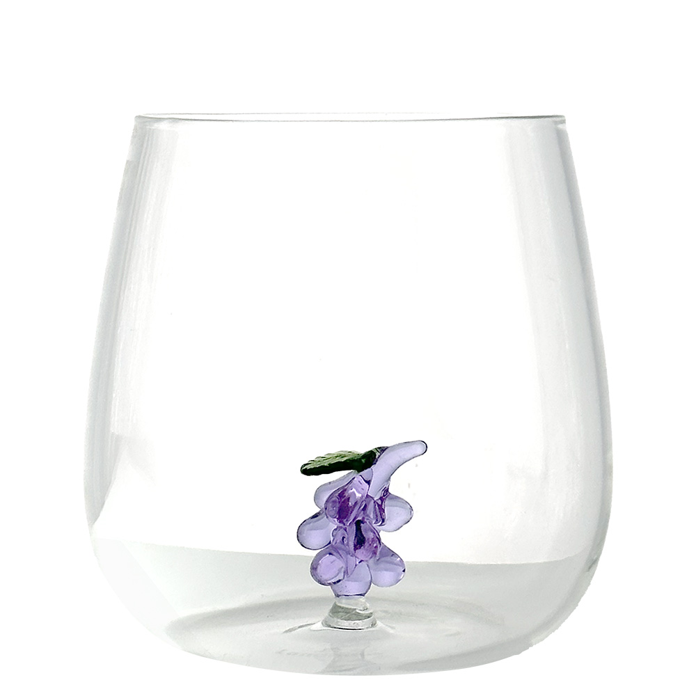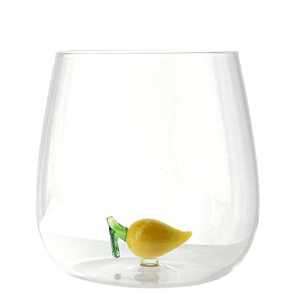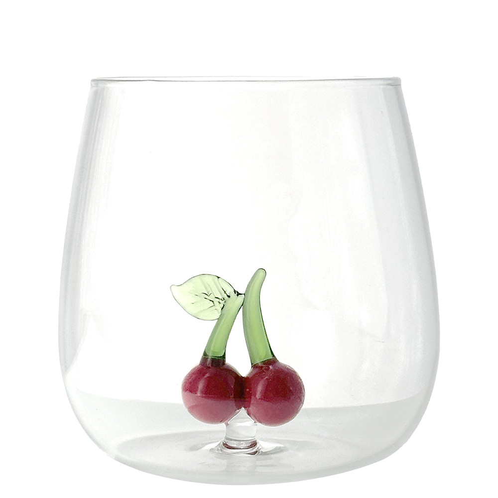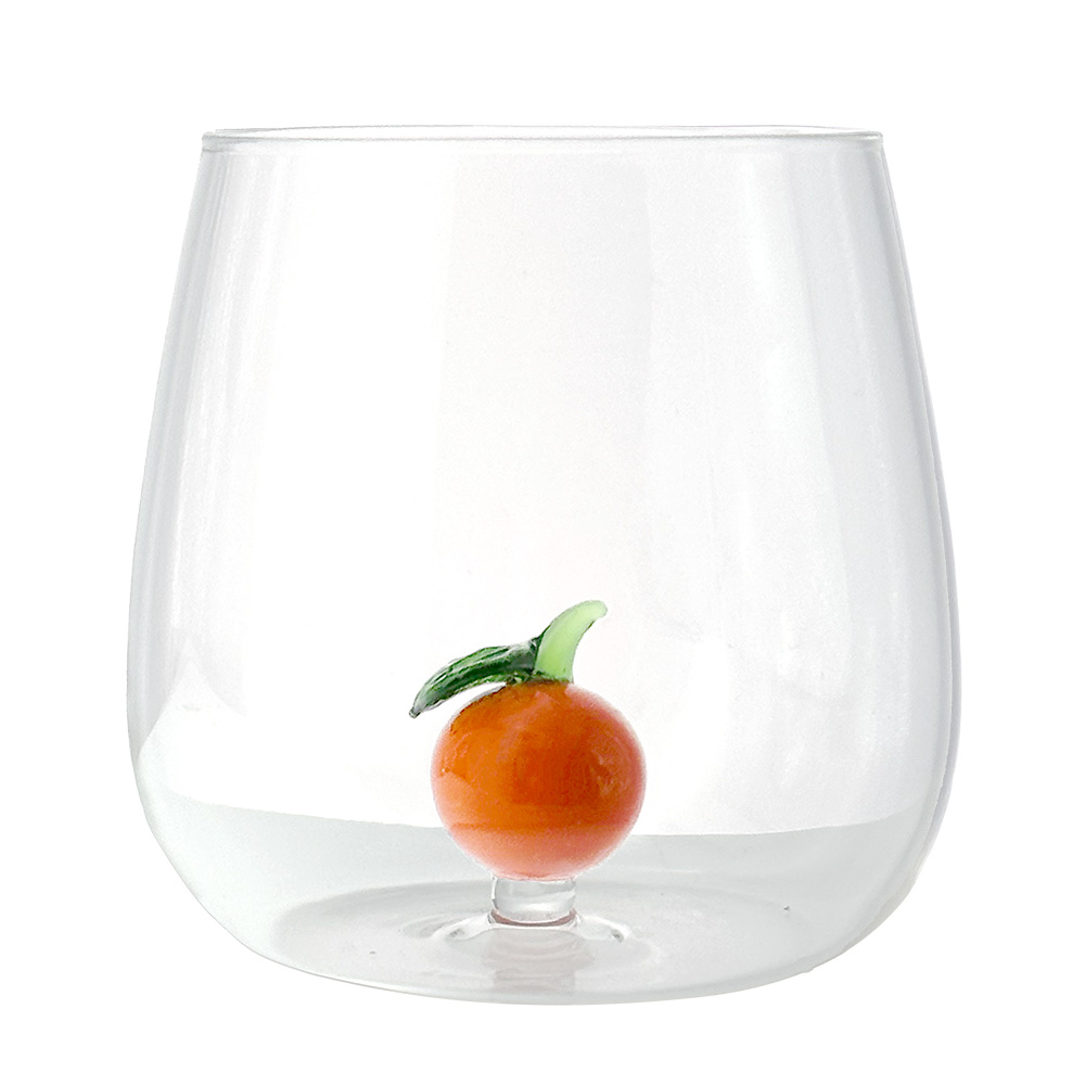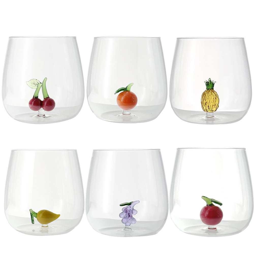 Each glass features a small hand-blown glass sculpture inside, depicting a fruit crafted with artisanal care and rich in detail.