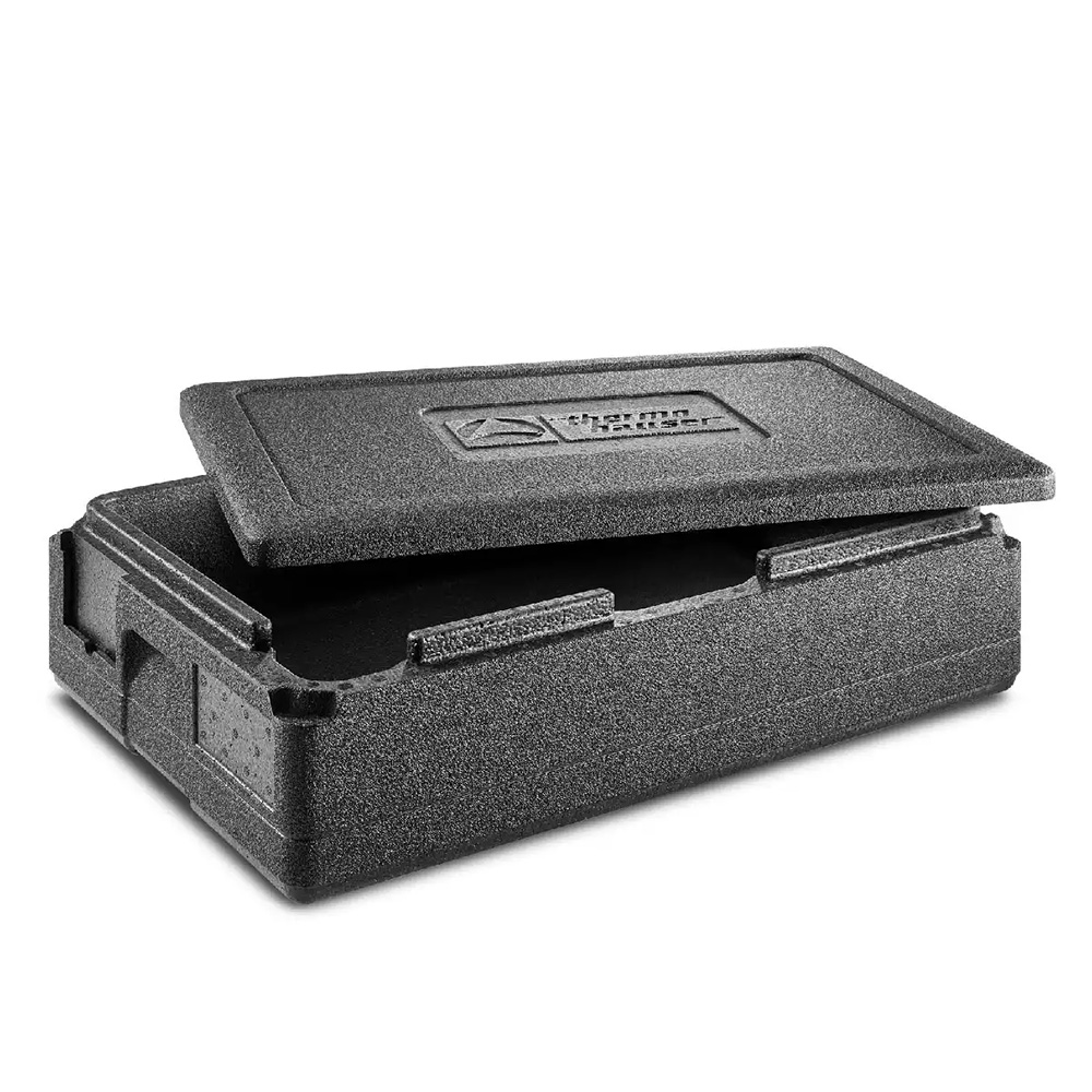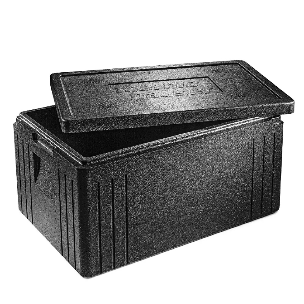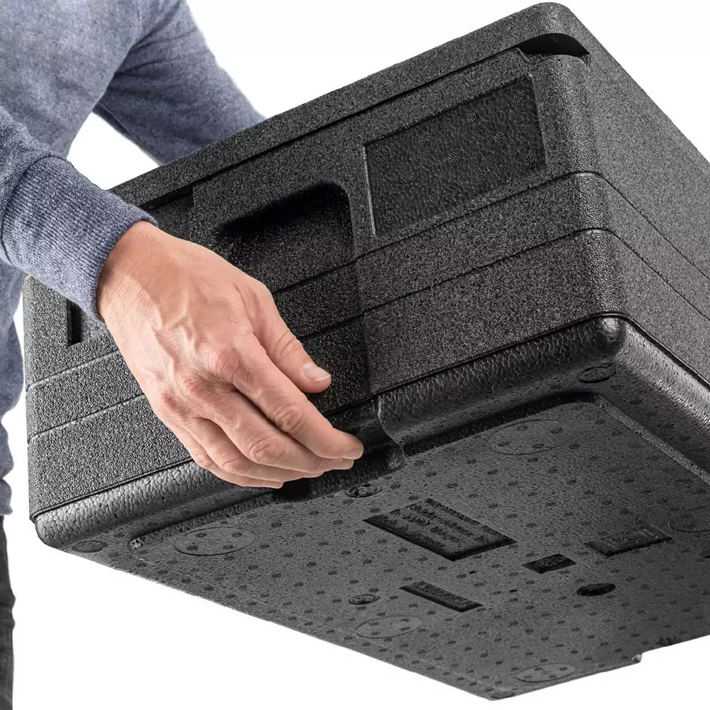 Insulated container made of black expanded polypropylene (EPP), an extremely lightweight, highly insulating, and very durable material.