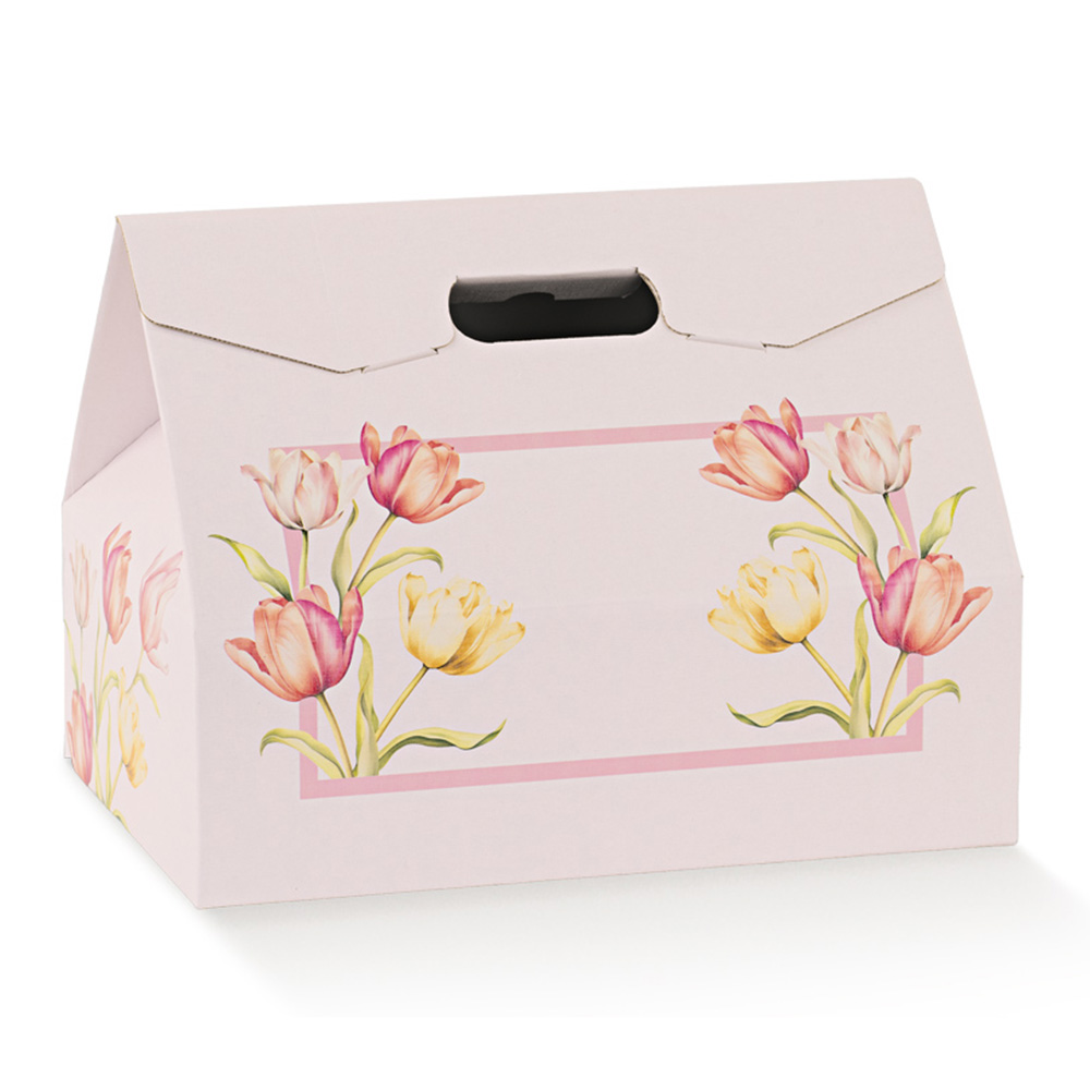 Tulips Chest Box, made of printed cardboard, with integrated handle Suitable for holding a 1 kg colomba cake. Size: cm 33.5 × 23.5 × 25 h