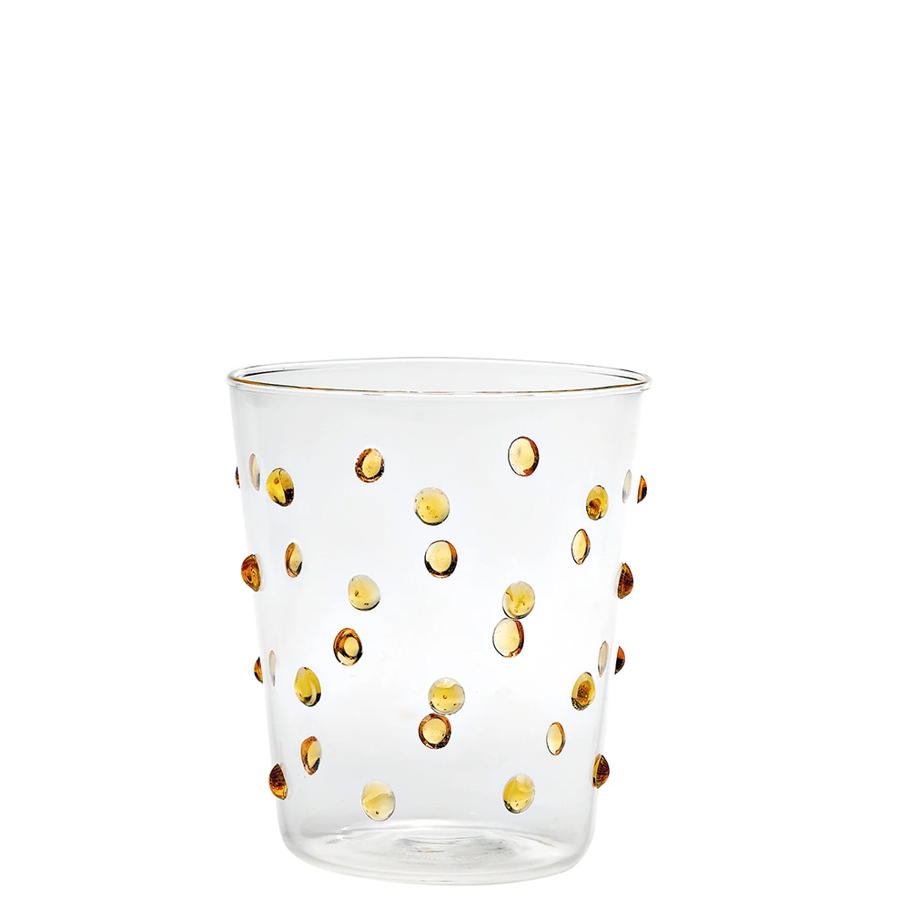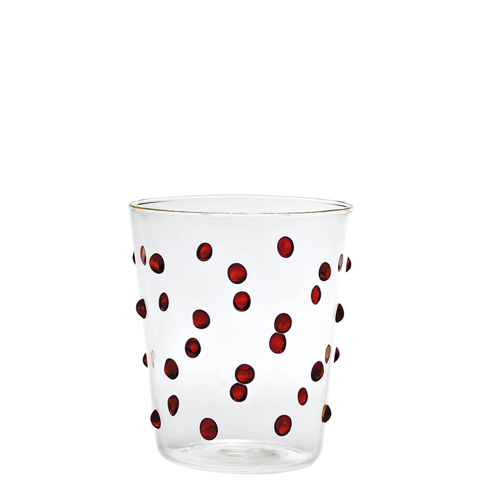 Glasses in transparent borosilicate glass for the Party Collection; refined encounter of colored pearls on these capacious and generous glasses, worked with patience and skill.