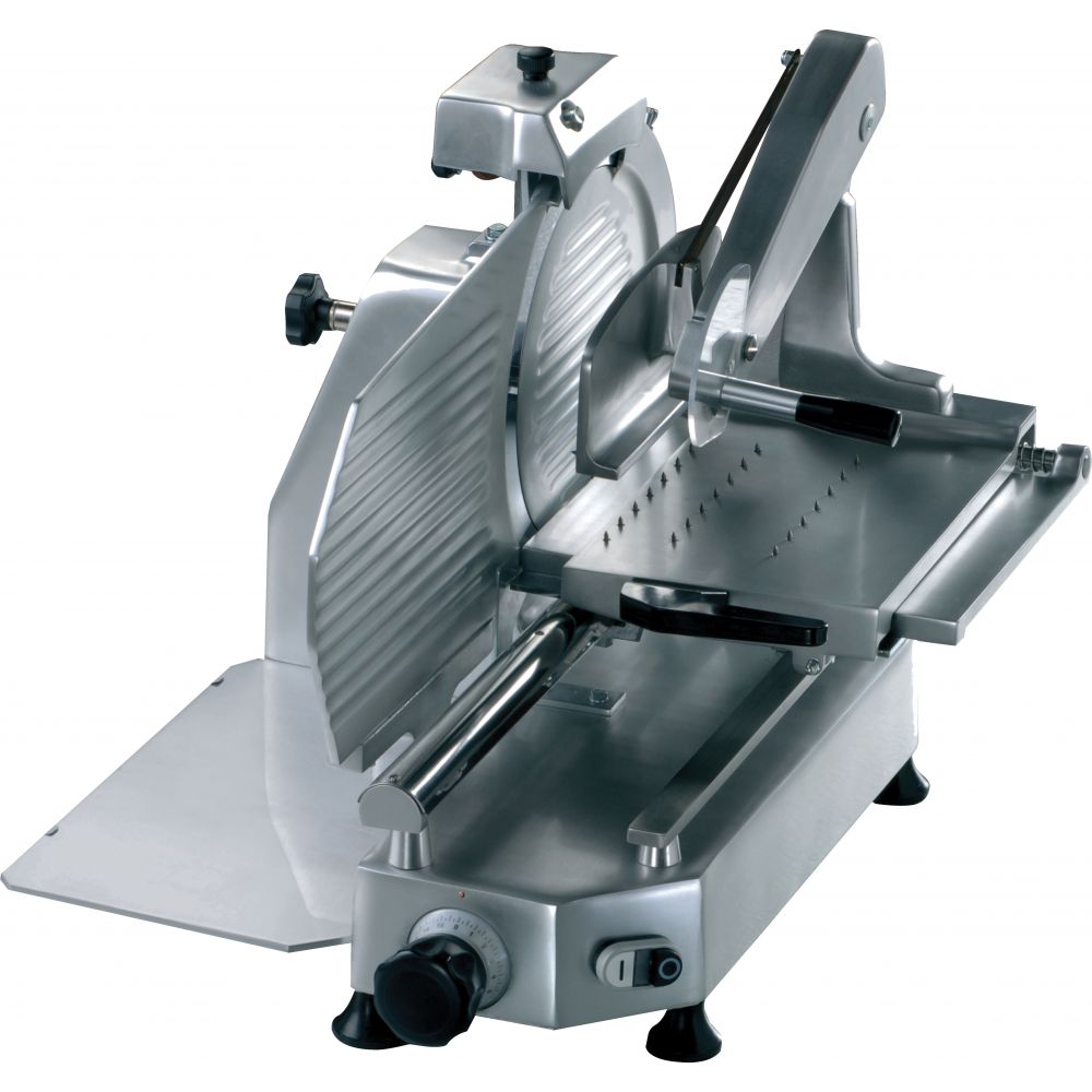 Vertical slicer three phase 370 PROFESSIONAL Dim. cm. 65x82x64h - peso Kg. 46 - Blade mm.370 - Rpm 260 - Cut thickness range mm.0-16 Cut: L x H mm 290x275 Made of aluminum alloy , anodized treated , are easy to clean. The regulator of cutting thickness from 0 to 16 mm is very sensitive and allows a decimal adjustment . The blade sharpener is easy to assemble for the user's work effective and sharp cutting . The plate mounted on ball bearings features exceptionally smooth running to cut heavy sausages, roasts, cheese, fish, compact meat and other.