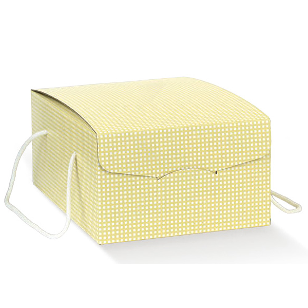 Yellow Vichy “Secret” Colomba Box, made of printed cardboard, with cord handles and concealed front closure.