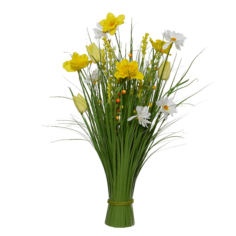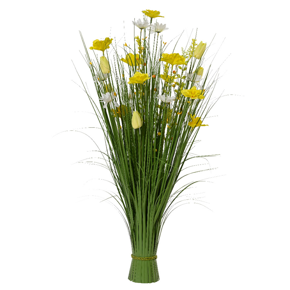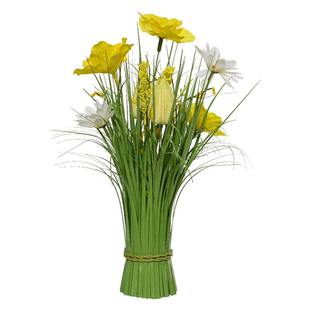 Yellow flower bush in polyester with grass stems, flowers, and berries